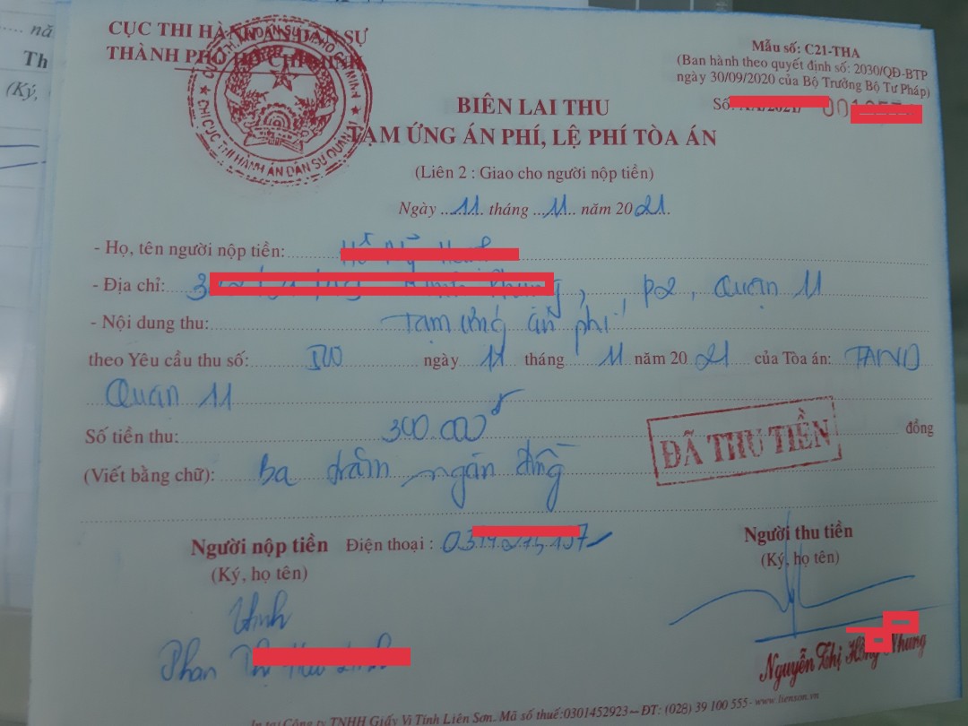 sau khi nhận thông báo đóng tạm ứng án phí, chúng tôi đến Chi cục thi hành án dân sự Quận 11 tại địa chỉ 1309 Ba Tháng Hai, Phường 16, Quận 11, TPHCM đóng tiền tạm ứng án phí là 300.000 đồng.