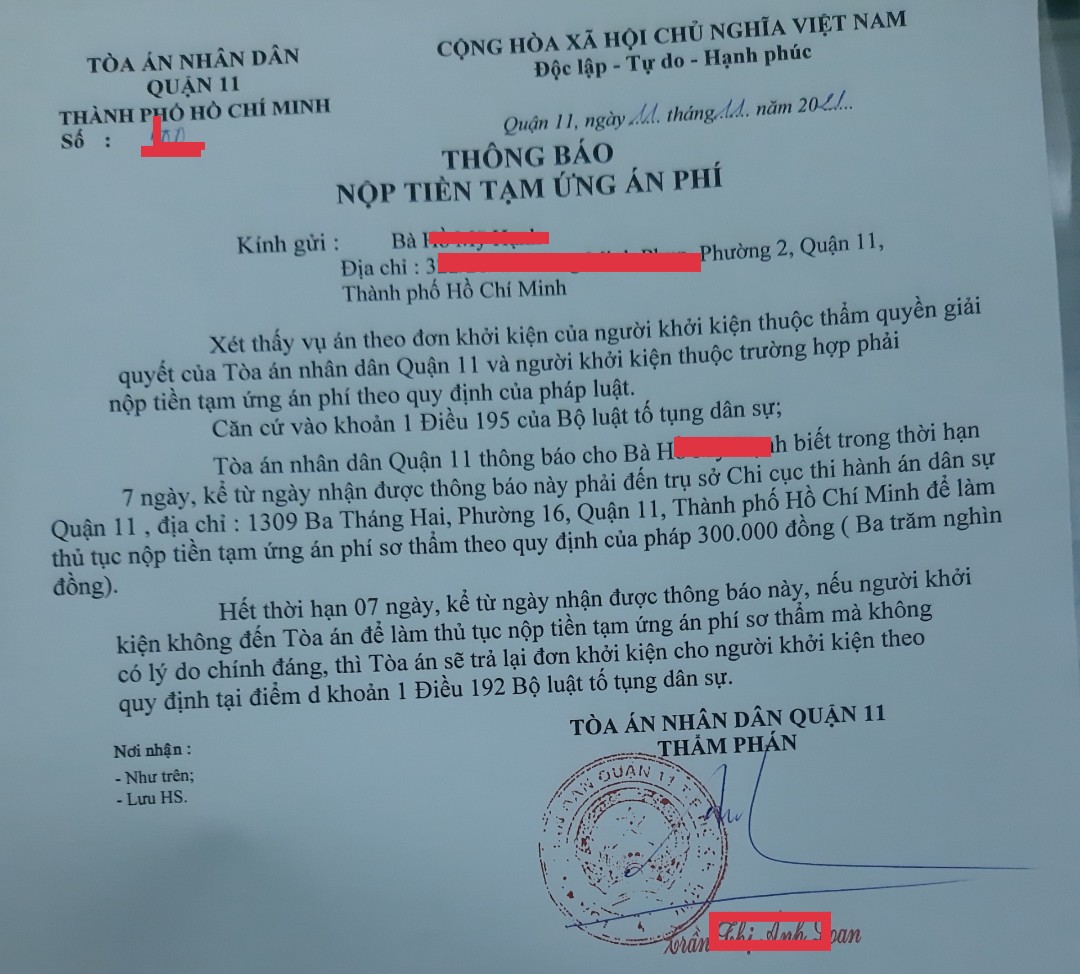 Ngày 11 tháng 11 năm 2021, Tòa án nhân dân Quận 11 đã ra Thông báo đóng tạm ứng án phí.