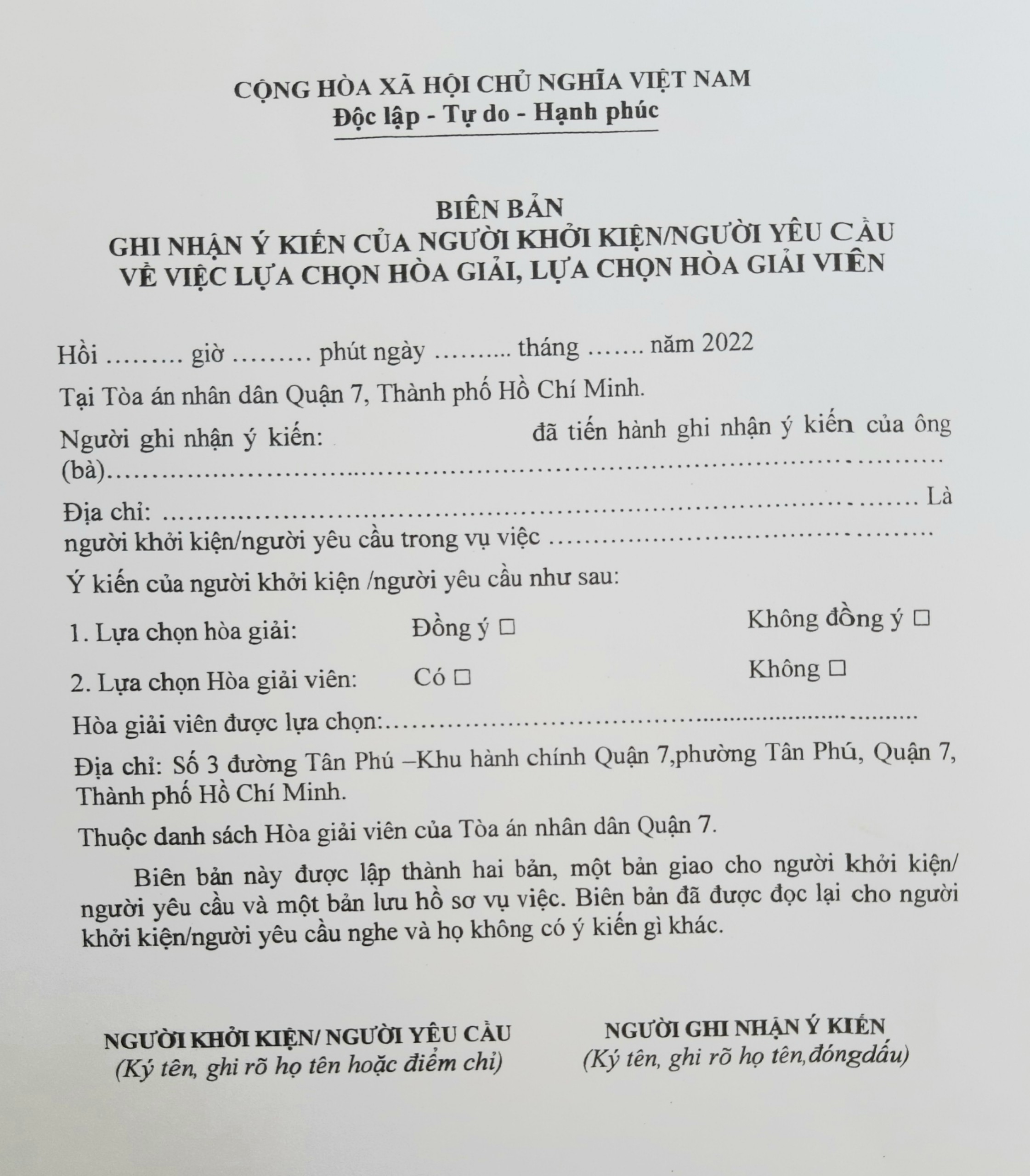 Biên bản này được lập thành hai bản, một bản giao cho người khởi kiện, người yêu cầu và một bản lưu hồ sơ vụ việc. Biên bản đã được đọc lại cho người khởi kiện/ người yêu cầu nghe và họ không có ý kiến gì khác.