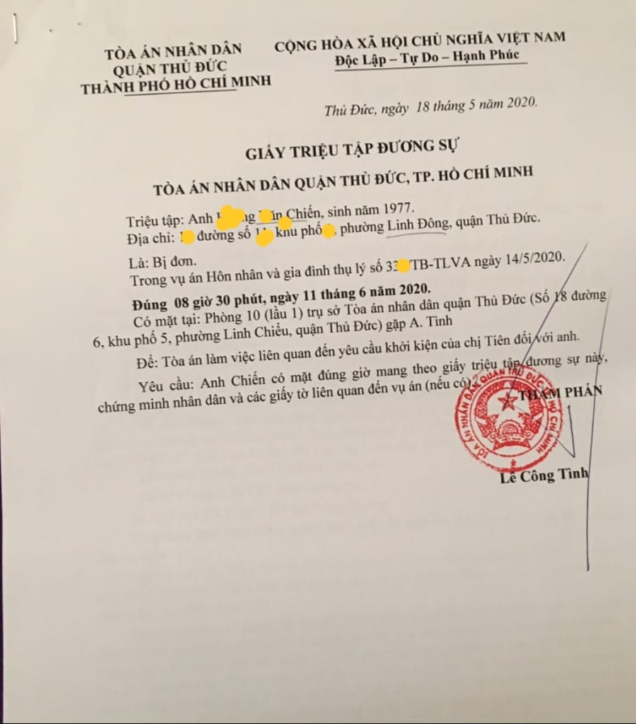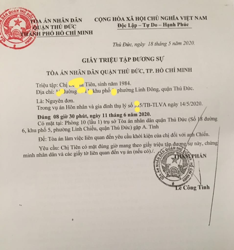 Ngày 18/5/2020, Tòa án đã gửi Giấy triệu tập đương sự cho chị Tiên và anh Chiến