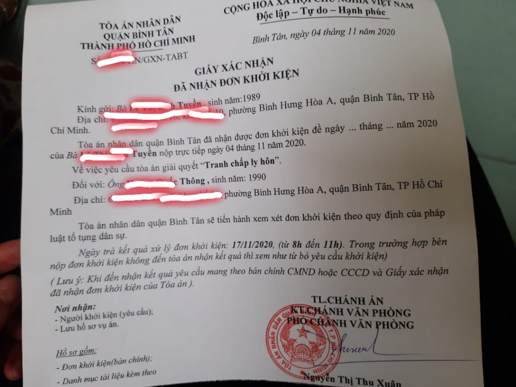Sau khi nộp đơn xong, chị Tuyền nhận Giấy báo nhận đơn khởi kiện từ Tòa án: