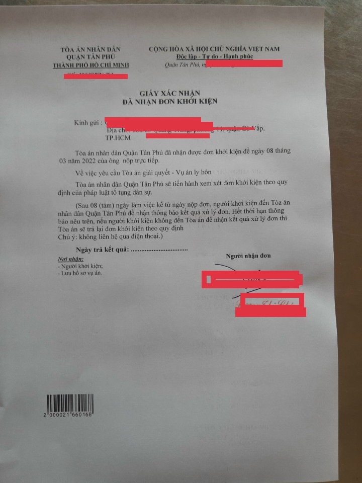 Ngày 03 tháng 08 năm 2022 chúng tôi đã nộp đơn ly hôn đơn phương tại Tòa án Quận Tân Phú, Thành phố Hồ Chí Minh.