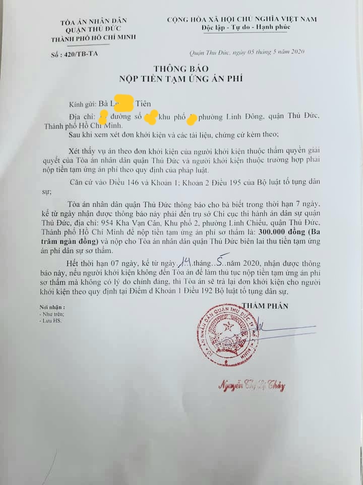 Sáng ngày, 14/5/2020, Trợ lý Luật sư công ty chúng tôi đã cùng chị Tiên đến TAND quận Thủ Đức (khi đi mang theo Biên nhận đơn khởi kiện để nộp lại cho Tòa án) và nhận Thông báo nộp tiền tạm ứng án phí