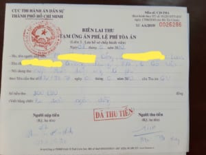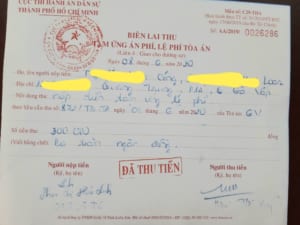 Sau khi nhận Thông báo này,ngày 08/6/2020 chị Loan và anh Công cùng Trợ lý Luật sư của công ty đã tới Chi cục Thi hành án dân sự quận Gò Vấp nộp tiền tạm ứng án phí  (300.000đ ) ( vì thời hạn đóng án phí theo quy định là 05 ngày kể từ ngày nhận Thông báo nộp tiền tạm ứng án phí) và quay lại TAND quận Gò Vấp nộp (Liên 3) Biên lai thu tạm ứng án phí cho Tòa án, anh chị giữ lại Liên 4 Biên lai.