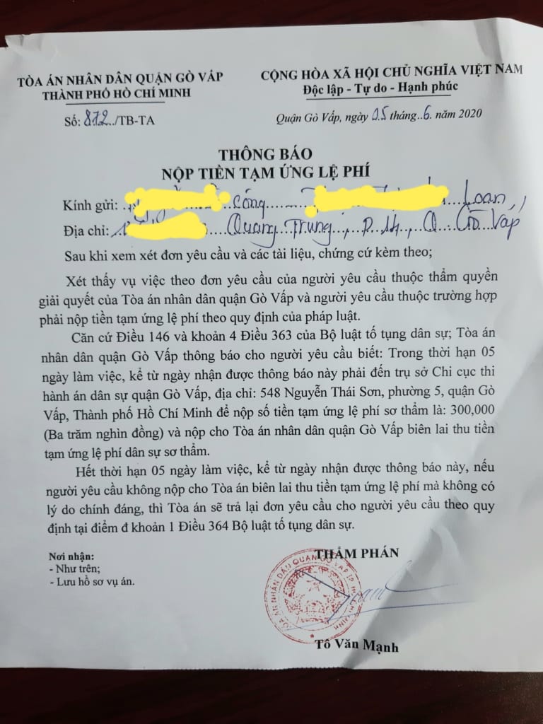 Sáng ngày, 05/6/2020, Trợ lý Luật sư công ty chúng tôi đã cùng anh chị đến TAND quận Gò Vấp (khi đi mang theo Biên nhận đơn khởi kiện để nộp cho Tòa án)  và nhận Thông báo nộp tiền tạm ứng án phí