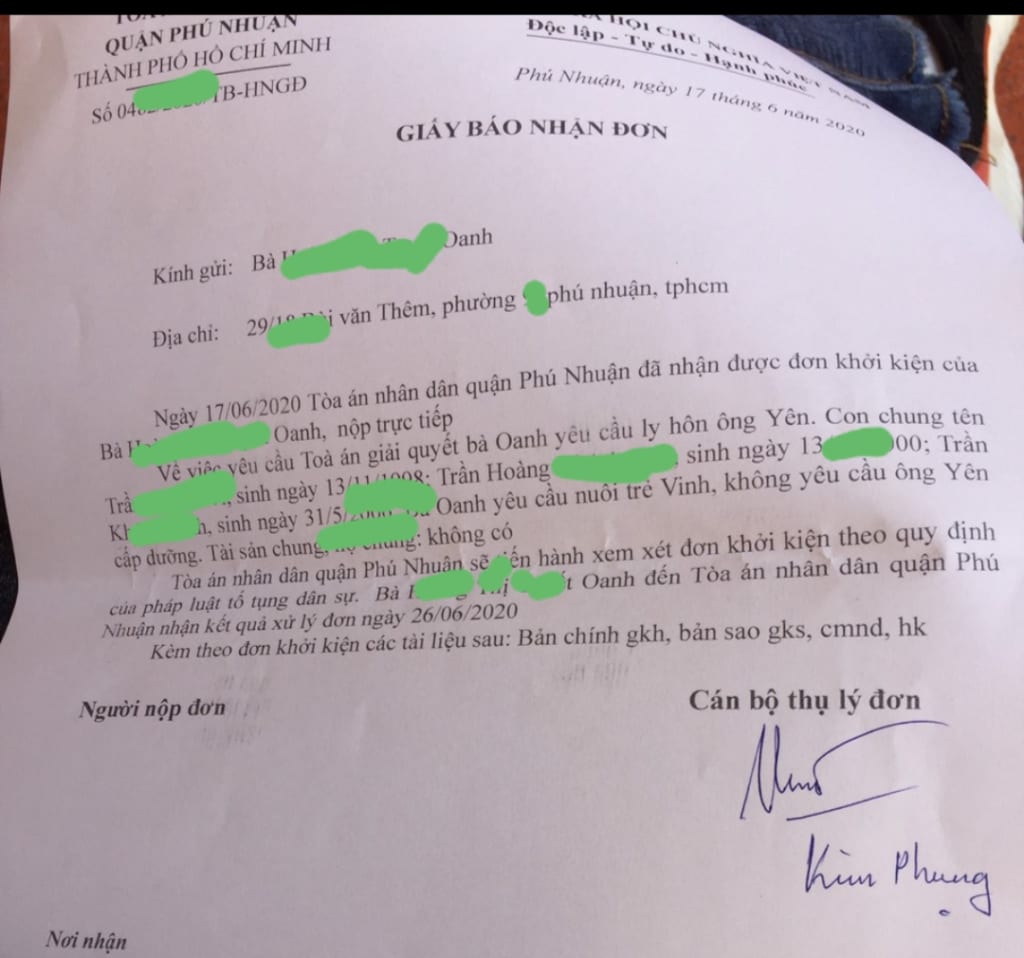 Sau khi nộp xong hồ sơ xin ly hôn tại TAND quận Phú Nhuận xong, chị nhận Giấy báo nhận đơn khởi kiện từ Tòa án: