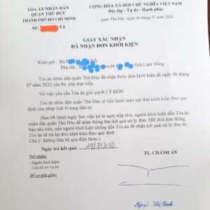 Ngày 06/7/2020, sau khi chuẩn bị đủ hồ sơ nộp đơn xin ly hôn đơn phương tại TAND quận Thủ Đức, Luật sư công ty cùng chị Hà đến TAND quận Thủ Đức để nộp đơn. Sau khi nộp đơn xong, chị Hà nhận Giấy xác nhận đơn khởi kiện từ Tòa án: