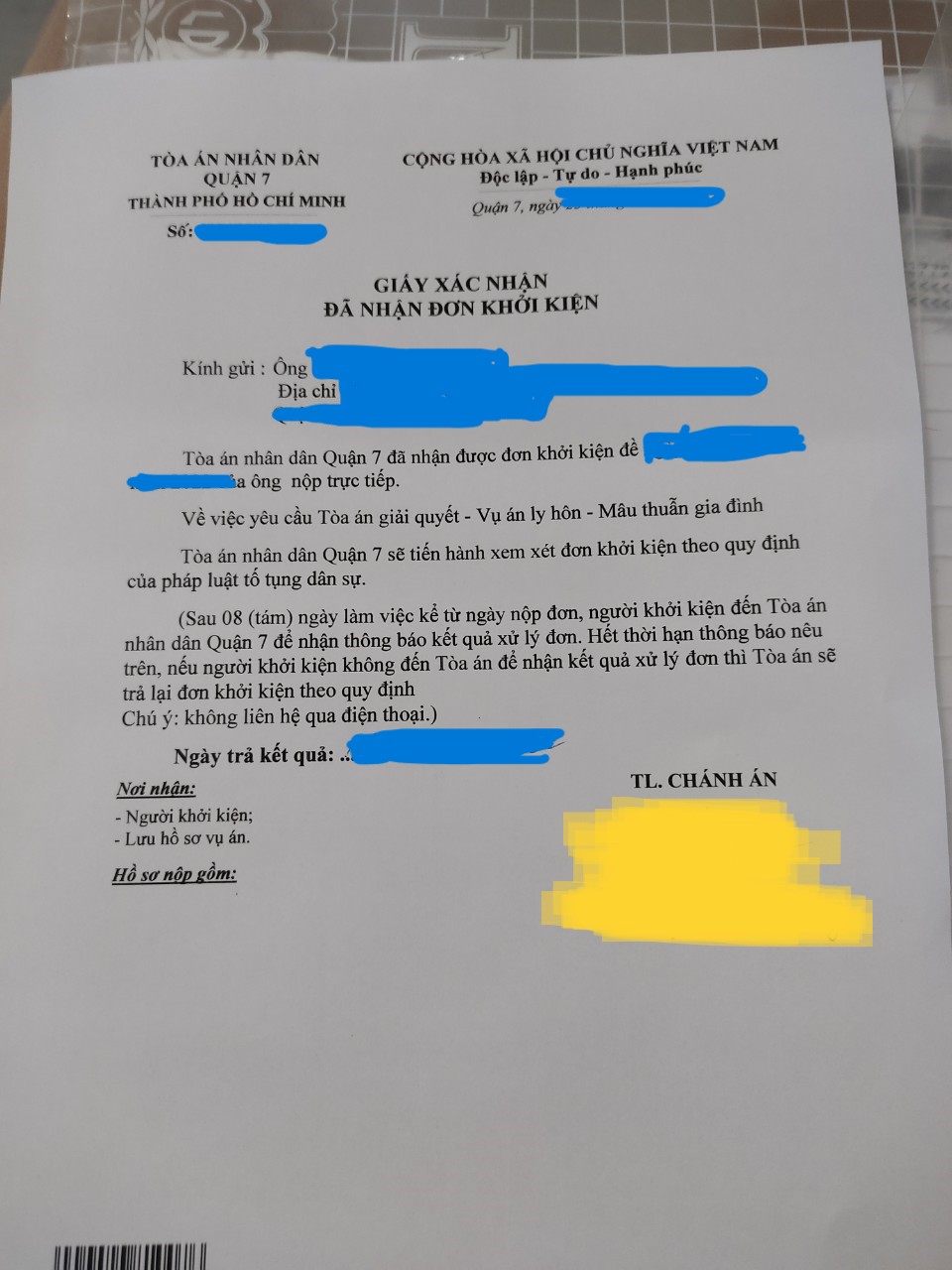 Sau khi nộp xong hồ sơ nộp tại TAND Quận 7 thì TAND Quận 7 đã thông báo anh T cung cấp đầy đủ hồ sơ và nhận Giấy xác nhận đơn từ Tòa án: