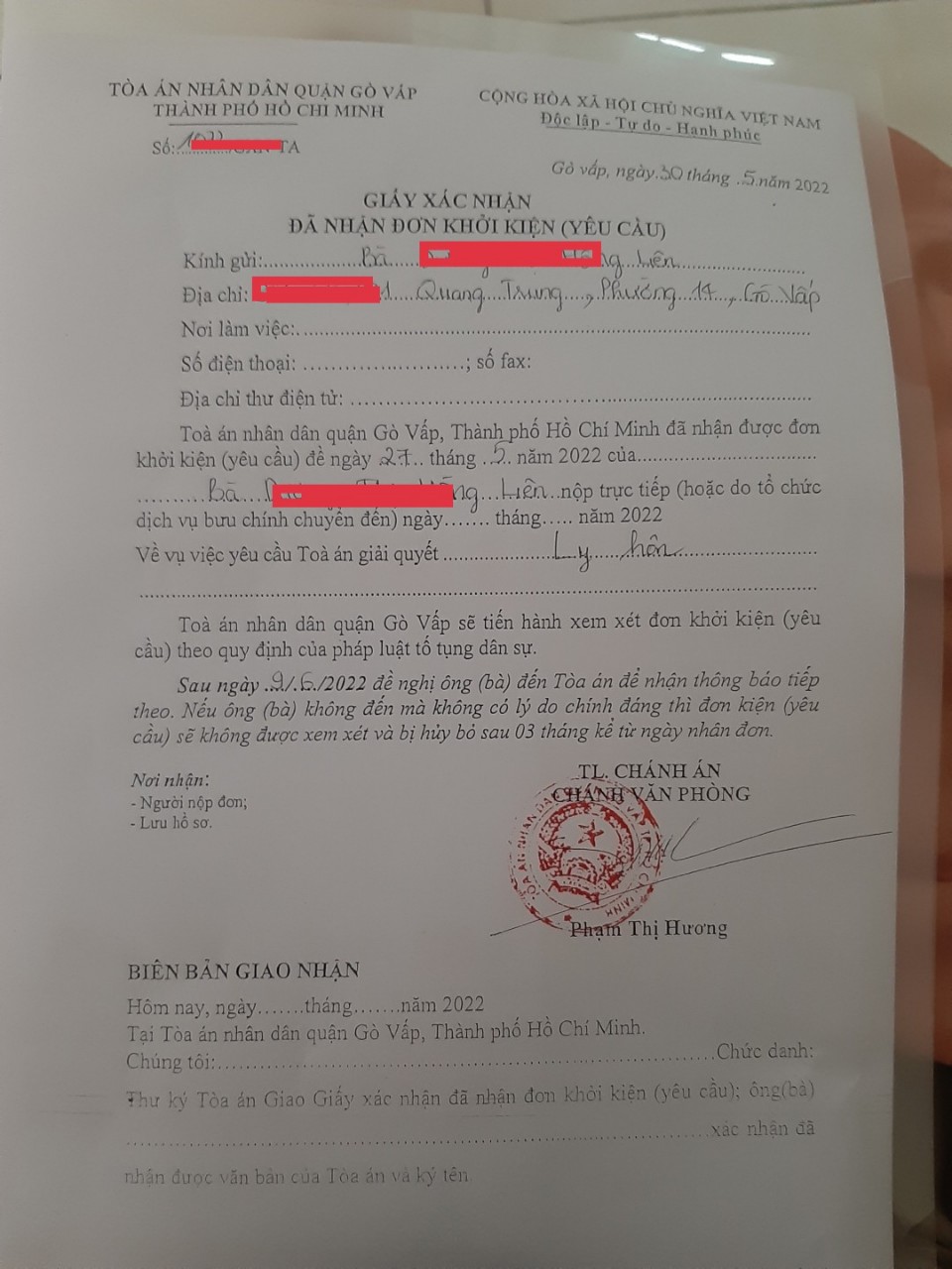Sau khi nộp xong hồ sơ xin ly hôn tại TAND quận Gò Vấp xong, chúng tôi nhận Giấy báo nhận đơn khởi kiện từ Tòa án: