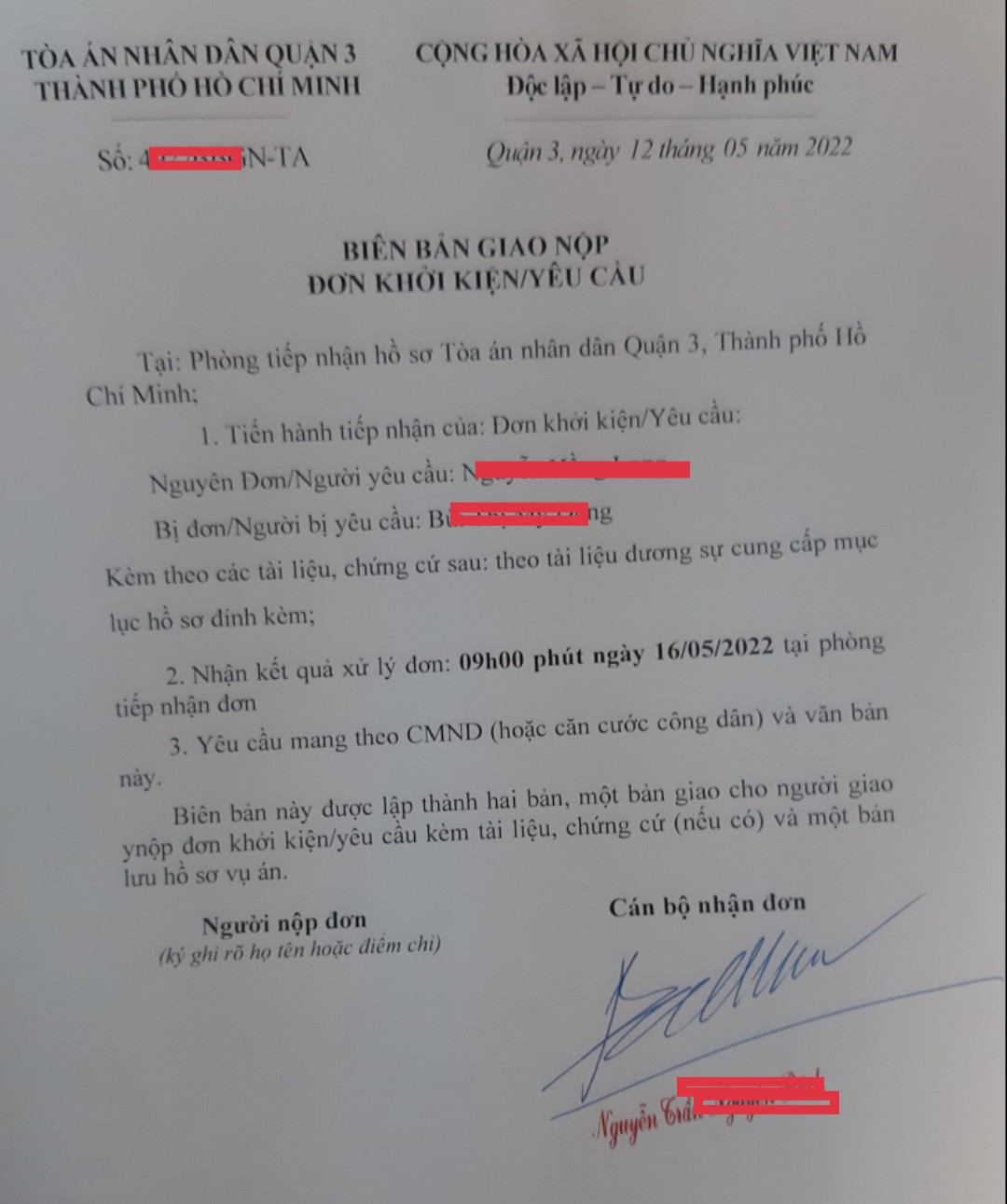 Ngày 05/12/2022 sau khi chuẩn bị đủ hồ sơ, chúng tôi đến nộp đơn ly hôn tại Tòa án Quận 3, Tp. Hồ Chí Minh.
