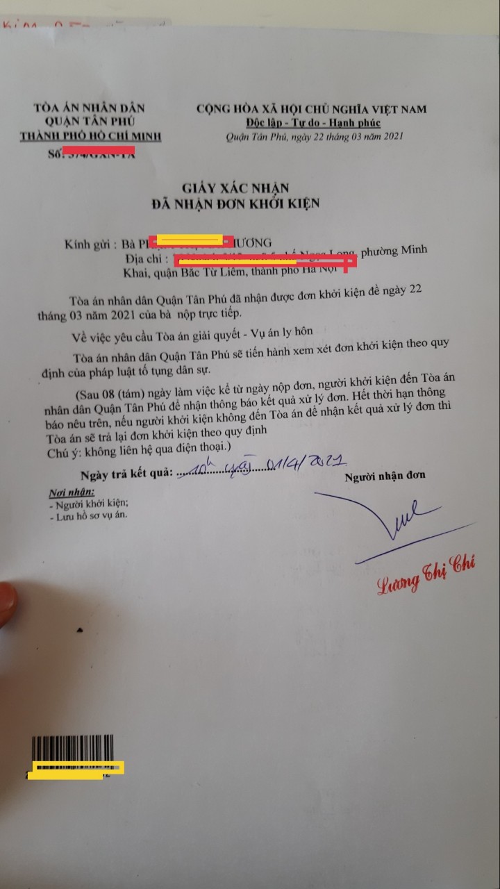 Sau khi nộp đơn ly hôn tại tòa ánTân Phú xong, nhận Giấy báo nhận đơn khởi kiện từ Tòa án: