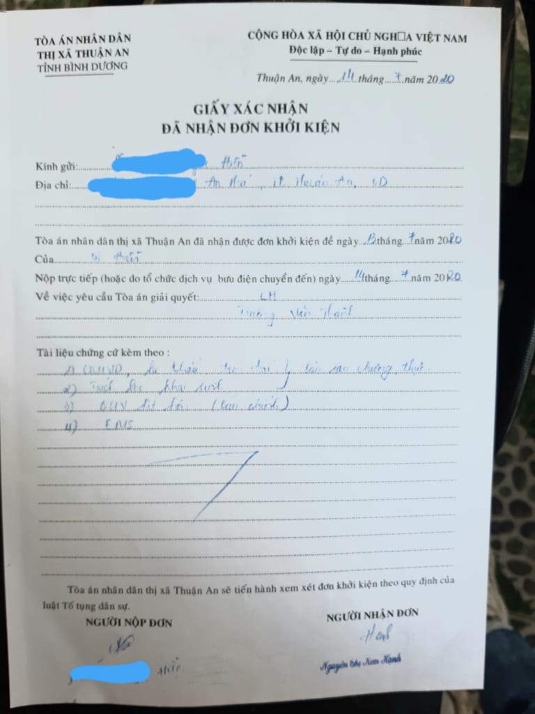 Ngày 14/7/2002 , sau khi chuẩn bị đủ hồ sơ nộp đơn xin ly hôn tại TAND thị xã Thuận An, Luật sư công ty cùng chị Hiền đến TAND thị xã Thuận An để nộp đơn. Sau khi nộp đơn xong, chị Hiền nhận Giấy xác nhận đã nhận đơn khởi kiện từ Tòa án: