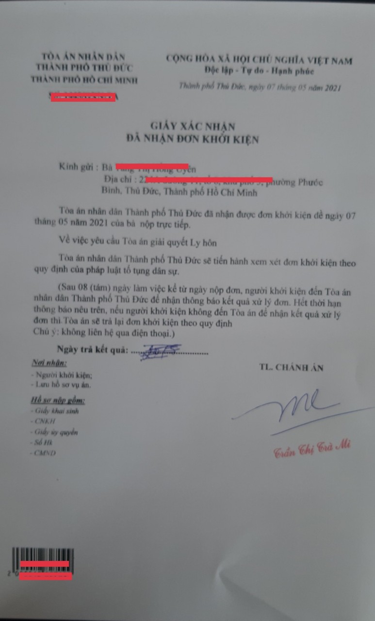 Sau khi nộp đơn ly hôn tại Quận 9 xong, nhận Giấy báo nhận đơn khởi kiện từ Tòa án: