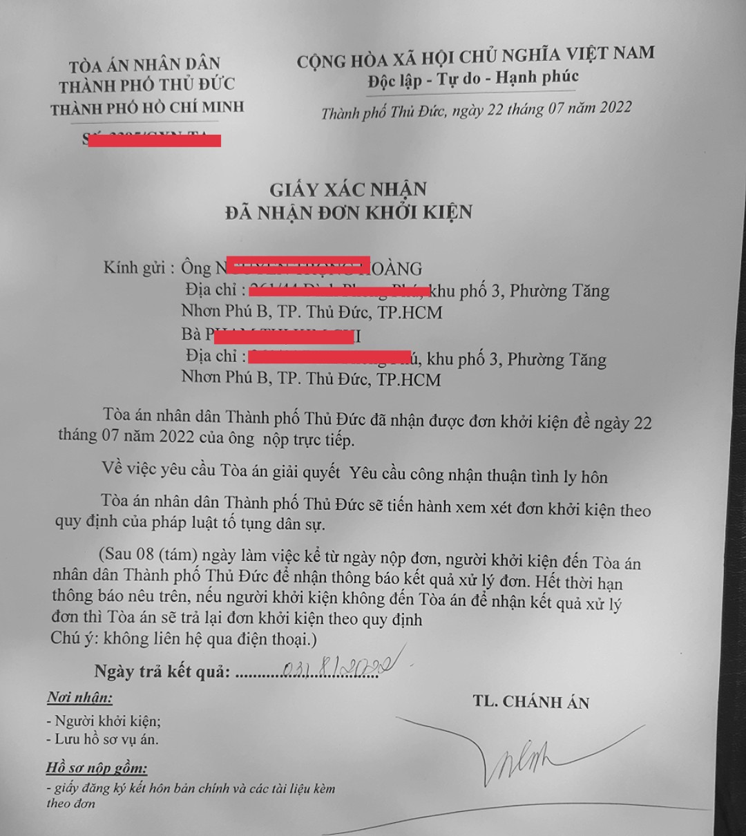 Sau khi nộp hồ sơ ly hôn tại Tòa án xong, nhận Giấy xác nhận đã nhận đơn khởi kiện từ Tòa án: