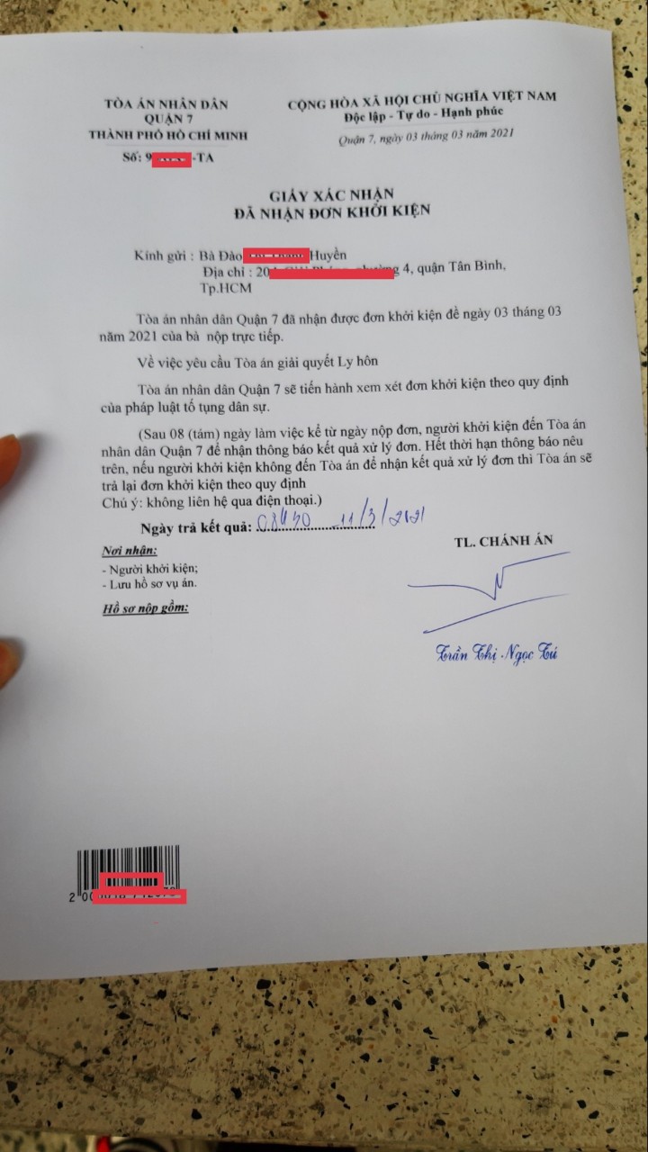 Ngày 06/1/2021 sau khi chuẩn bị đủ hồ sơ, nhân viên công ty chúng tôi đến nộp đơn ly hôn đơn phương Quận 7