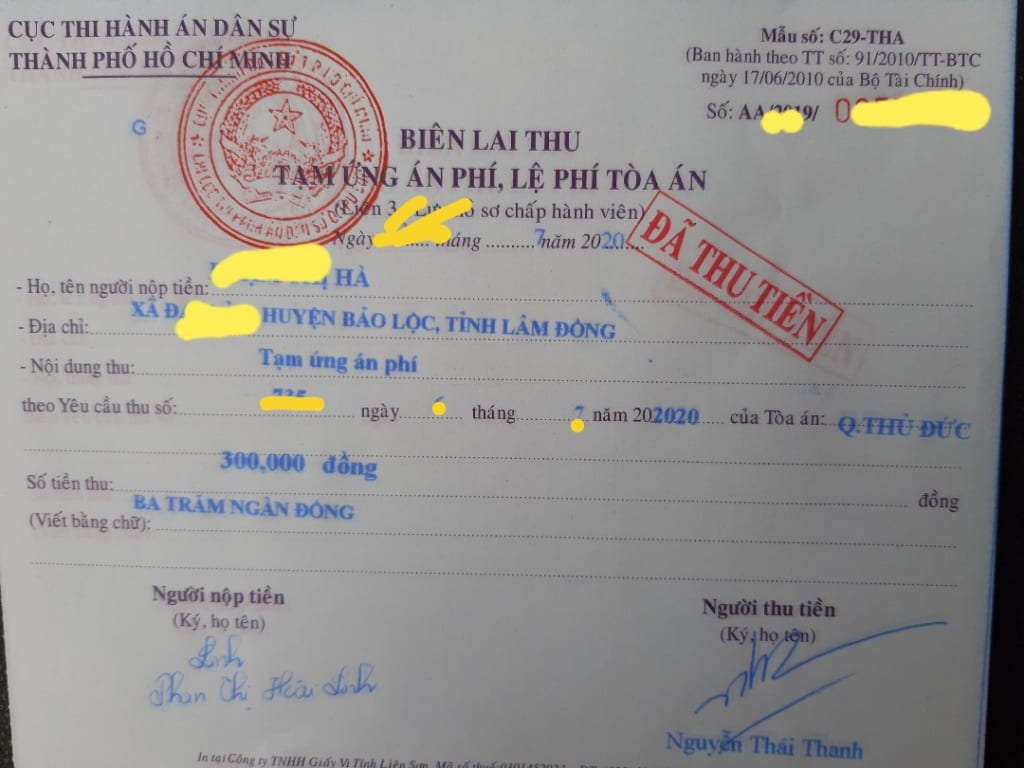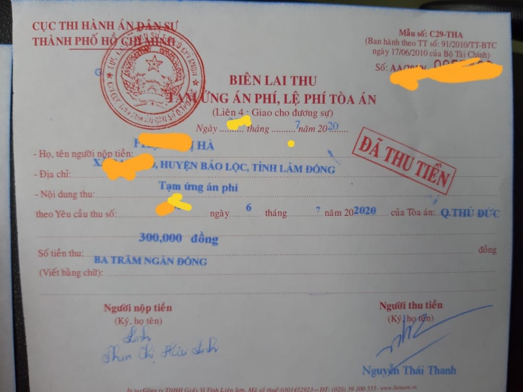 Sau khi nhận Thông báo này, chúng tôi đã tới Chi cục Thi hành án dân sự quận Thủ Đức nộp tiền tạm ứng án phí (300.000đ)- ly hôn. Sau đó tiếp tục quay lại TAND quận Thủ Đức nộp (Liên 3) Biên lai nộp tiền tạm ứng án phí cho Tòa án, chị giữ lại Liên 4 Biên lai.