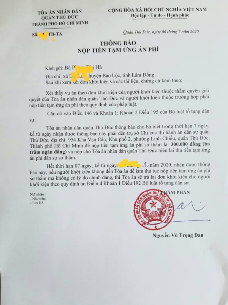 Ngày 14/7/2020, Luật sư công ty chúng tôi đã cùng chị Hà lên TAND quận Thủ Đức nhận kết quả xử lý đơn (khi đi mang theo Biên nhận đơn khởi kiện để nộp lại cho Tòa án) và nhận Thông báo nộp tiền tạm ứng án phí :