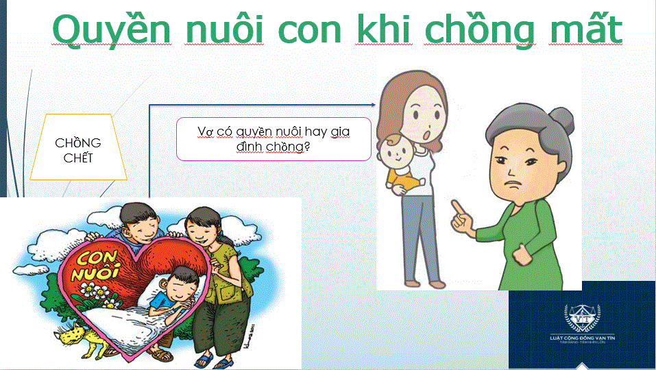 - 2.1 Đối với trường hợp của bạn khi chồng của bạn không may qua đời (chết) thì bạn hoàn toàn có quyền và nghĩa vụ đương nhiên đối với việc chăm sóc nuôi dưỡng con của bạn, trừ trường hợp bạn bị hạn chế quyền của cha mẹ đối với con chưa thành niên: